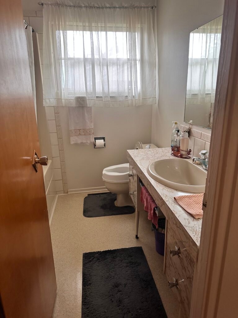 installed a new tile shower, vanity, tile floor, and toilet. as well as paint and trim. we maximized the space available by pushing the shower into neighboring closet space.